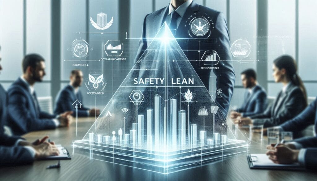 Modelo visual de Safety Lean integrando pirámide de prevención de accidentes, dashboards KPI y gestión estratégica de riesgos en entorno corporativo.